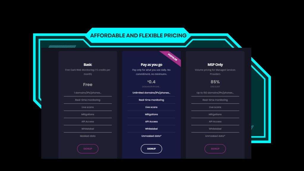 | Pay as you go | $0.4 per domain/IP/phoneUnlimited domains/IPs/phonesIncludes real-time monitoring, live scans, mitigations, API access, white-label option, unmasked data. |
